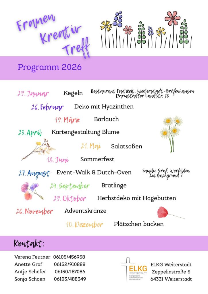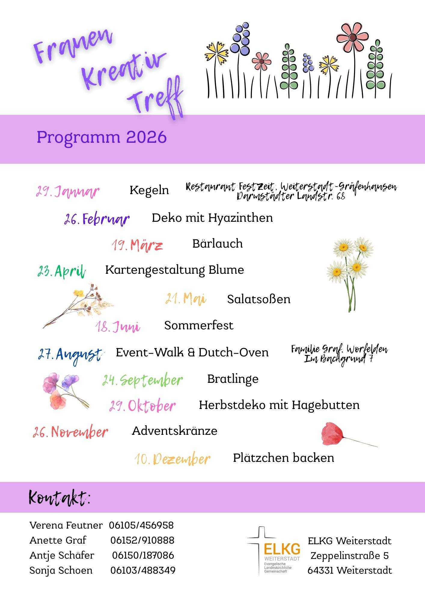 Wir Frauen treffen uns ca. 1 x im Monat donnerstags um 20 Uhr im Gemeindehaus der ELKG und laden herzlich dazu ein! Wir sind eine fröhliche Gruppe zwischen 18 und 80 Jahren und sind gerne kreativ; wir kochen, backen und haben gute Gespräche dabei.